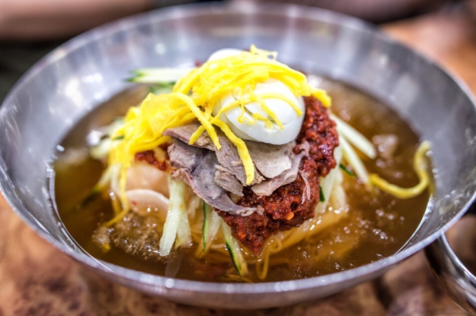 Milmyeon is chewy and often served in a cold broth with cucumber, beef, and pear slices. Depending on the restaurant, it may also include a spoonful of gochujang sauce. The noodles are made from a mix of wheat flour and sweet potato starch.