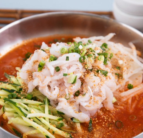 Mullehoe is a dish consisting of fresh raw fish in a cool broth, similar to Japanese sashimi. Thin slices of fish are often served in a spicy broth made with vinegar or doenjang mixed with chili paste.
