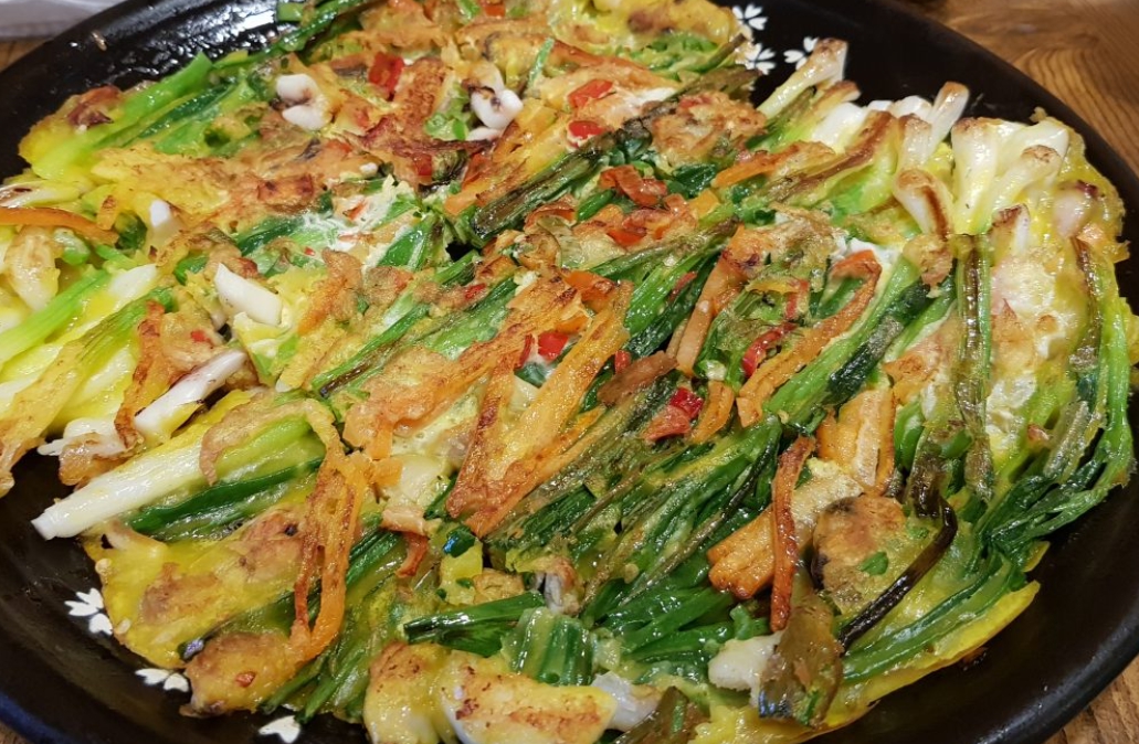 This pancake is made by mixing rice flour, seafood, and green onions.