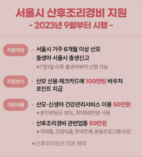 출산 후 산후 조리는 모든 산모에게 반드시 필요한 일이다. 하지만 경제적인 여건이나 여러가지 이유로 산후조리를 제대로 하지 못한다면 산모와 아이에게 모두 좋지 않다. 따라서 서울시에서는 출산 후 산후조리 지원 정책을 통해 산모들의 건강한 산후조리를 돕고 저출산을 극복하고자 정책을 실시한다.