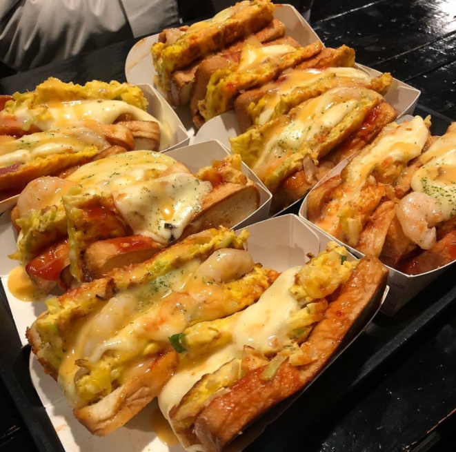 한국의 길거리 토스트는 부산 길거리 음식의 가장 유명한 예 중 하나입니다. 기본적으로 흰 빵 두 조각으로 만든 구운 샌드위치입니다.