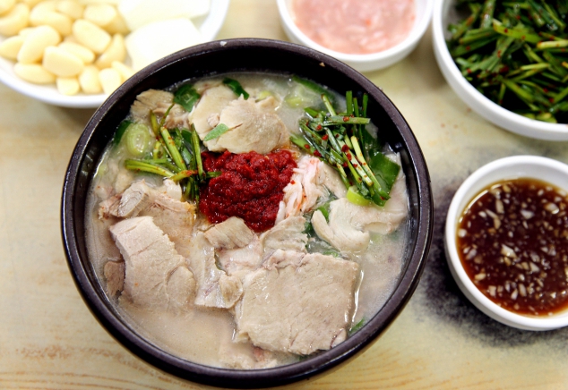 돼지국밥은 단순한 음식이 아닙니다. 요리사는 몸에 좋은 국물을 만들기 위해 돼지 고기를 삶는 데 몇 시간을 보냅니다. 뼈를 제거한 후 청주, 참기름, 간장을 추가합니다. 그런 다음 찐 밥 위에 붓고 다양한 반찬과 함께 제공됩니다.