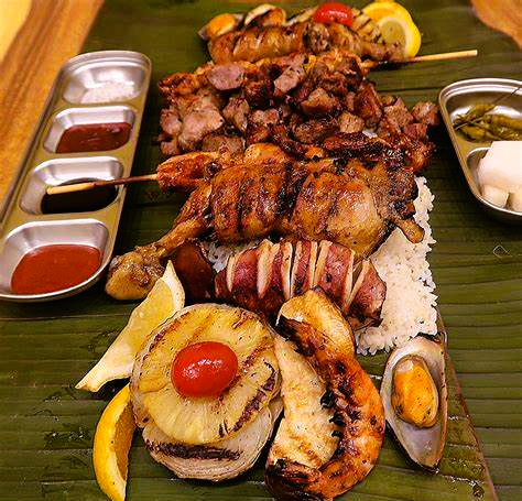 부산 강서구 필리핀음식 부들파이터는 그릴에 구운 닭꼬치 오징어 생선 돼지고기 새우 홍합 꼬지 파인애플 양파 오렌지 레몬 등등 다양한 메뉴들을 커다란 바나나잎 위에 올려놓고 비닐장갑 끼고 손으로 먹는 음식이에요.